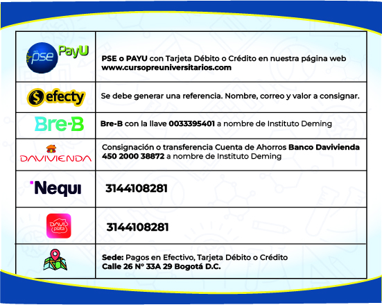 El preuniversitario preicfes Deming, es una institución líder, con 37 años de experiencia en preparación para las pruebas de estado icfes, con nuestro preicfes saber 11° y el preuniversitario Pre Unal para el ingreso a la Universidad Nacional.